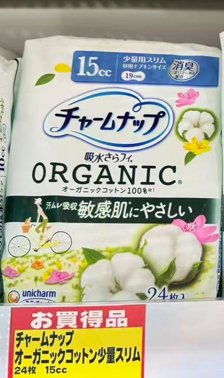 苏菲 UNICHARM尤妮佳 100%有机棉量少用抗菌消臭卫生巾护垫 15cc19cm 24枚入